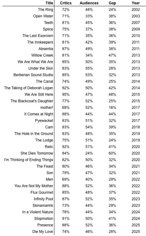 Budget Tier / Release Strategy — I think critics can be more forgiving and even appreciative of low-budget independent films than paying customers. They can assess originality and ingenuity separately from production values. Audiences (with the exception of the most hardcore fans) may expect more polish. I’d say that the structural and financial context of a horror film (i.e. production, perceived widespread appeal, and the marketing strategy inherent to studio films) does help to inform consensus, aligning critics with audiences. High budget films, on the whole, tend to be less divisive, either positively or negatively.